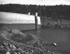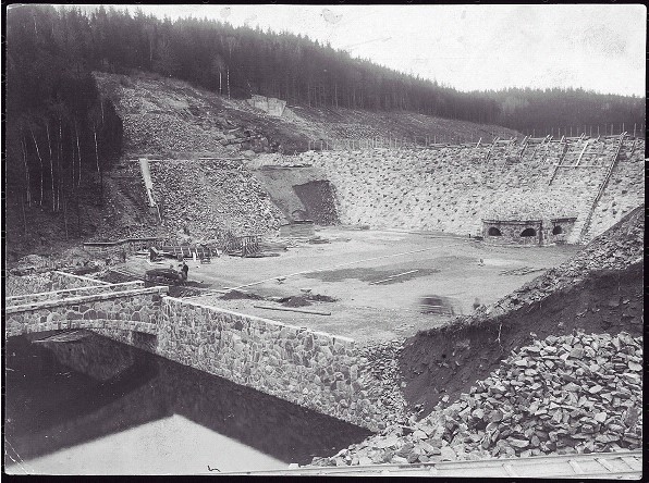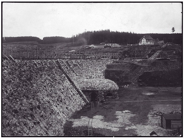 Talsperre, Klingenberg [K3], 1908-1914. Staumauer im Bau, Ostansicht, 13.10.1912. Links ist die Verzahnung mit der noch nicht aufgebrachten Betonschicht zu erkennen. HStADD, Bestand „Talsperrenbauamt Klingenberg (10951)“