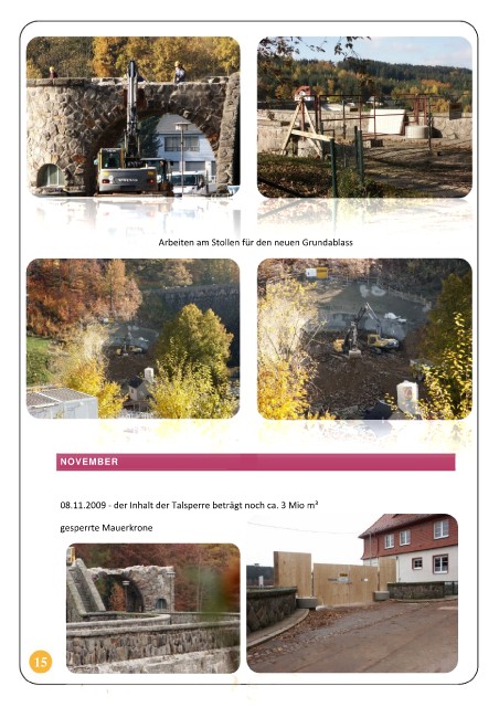 Arbeiten am Stollen für den neuen Grundablass NOVEMBER 08.11.2009 - der Inhalt der Talsperre beträgt noch ca. 3 Mio m³ gesperrte Mauerkrone 15