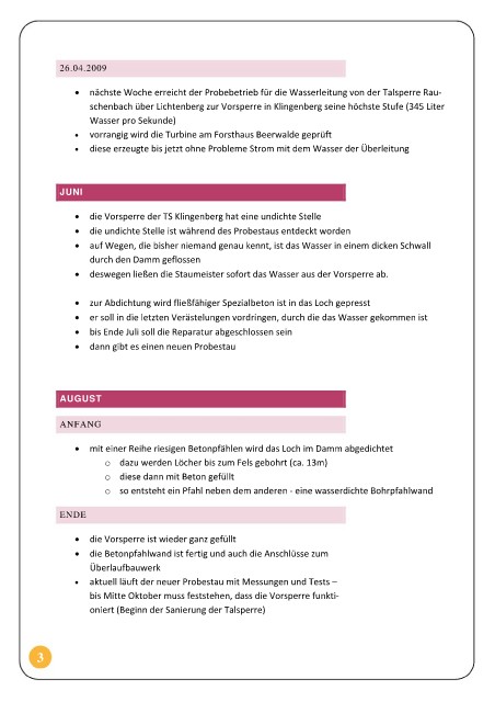 •  nächste Woche erreicht der Probebetrieb für die Wasserleitung von der Talsperre Rau-