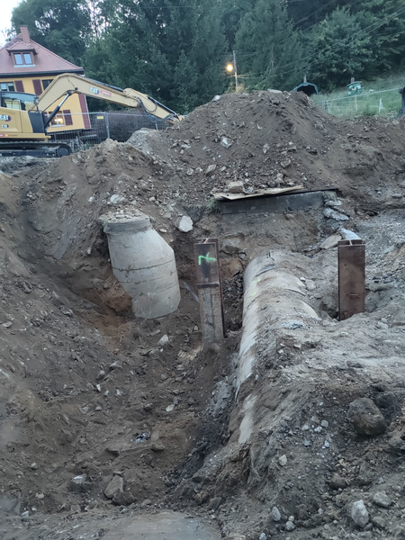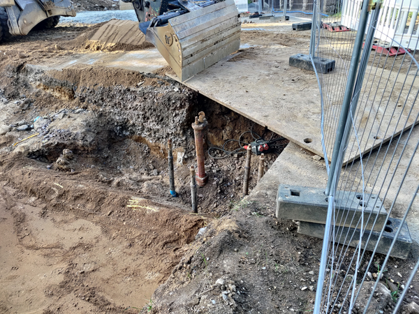 Heute begannen die Bauarbeiten an der Rohwasserleitung. Dabei kam es nach 17:00 Uhr zu einer Beschädigung der Gasleitung (Mitteldruck-Versorgungsleitung).